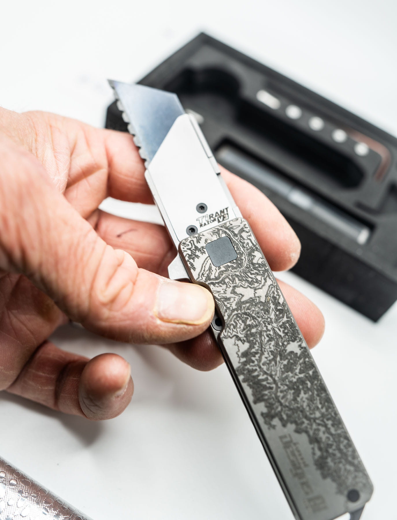 ITEM #16B — TiRant RAZOR V3 Custom Topo Laser Engraving W/Jet-Black Hardware + W/Mini Clip + W/Pry Bar (Stonewashed 6AL-4V Ti + Box Kit) 9/10 BLEM / RARE — Only One Available