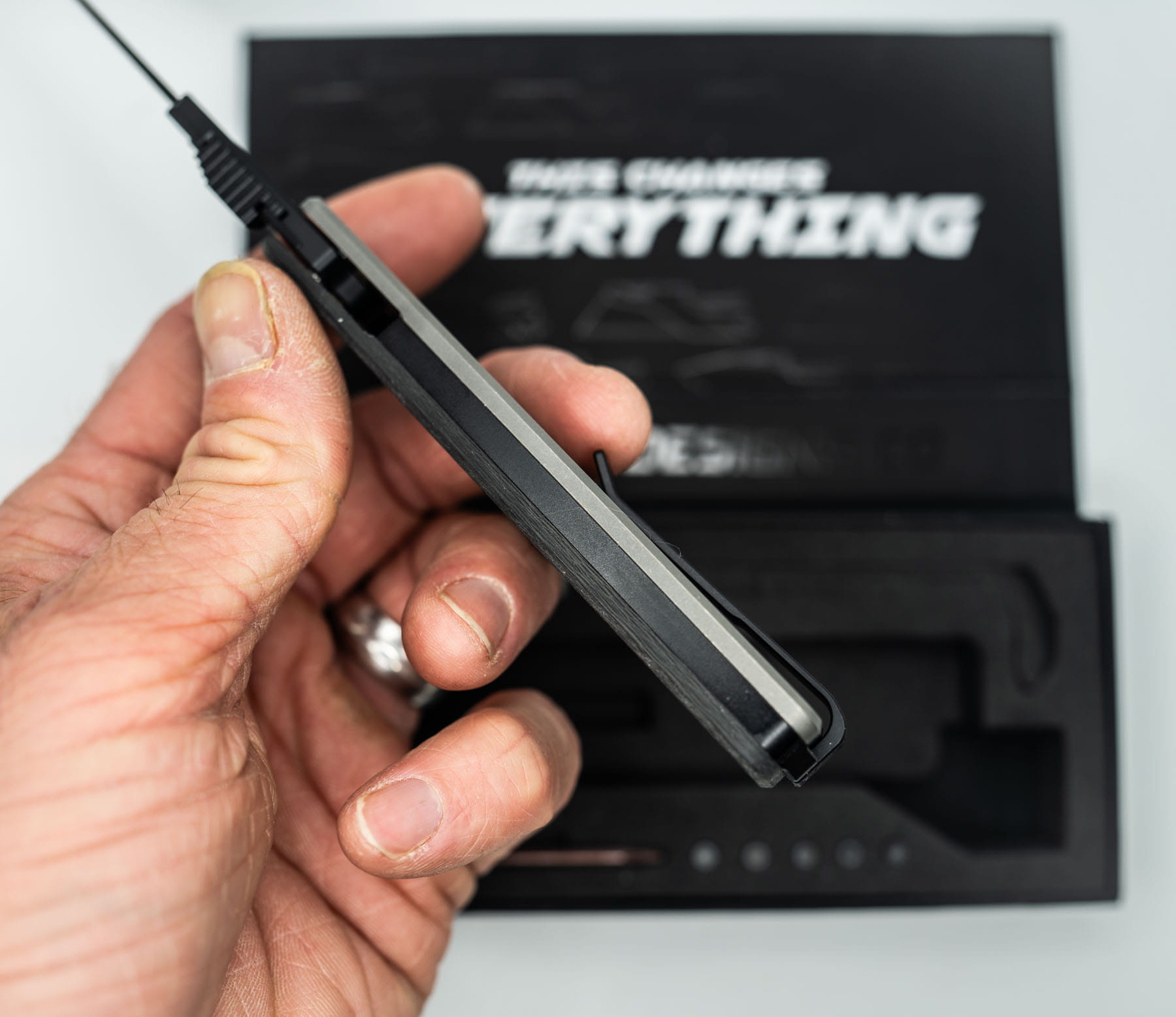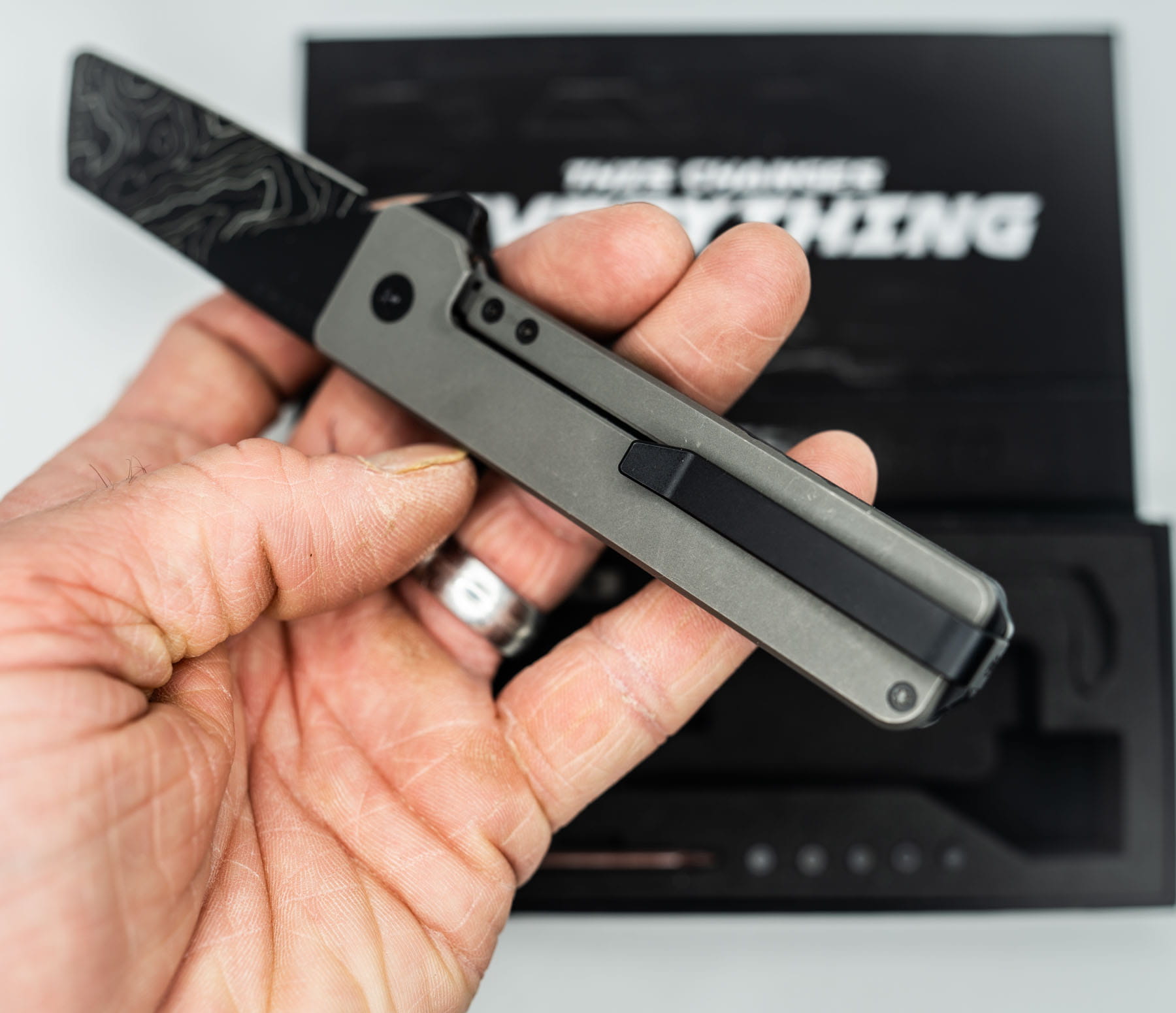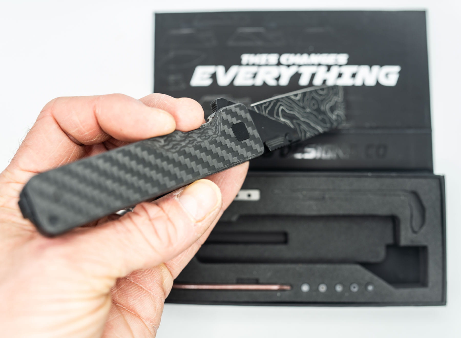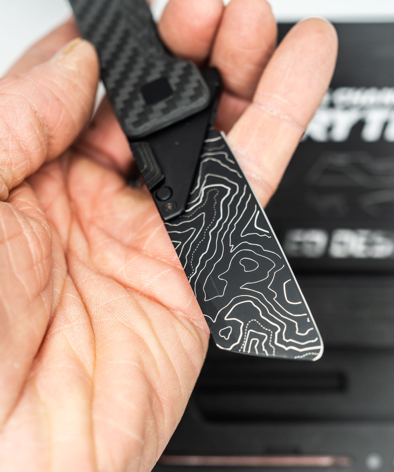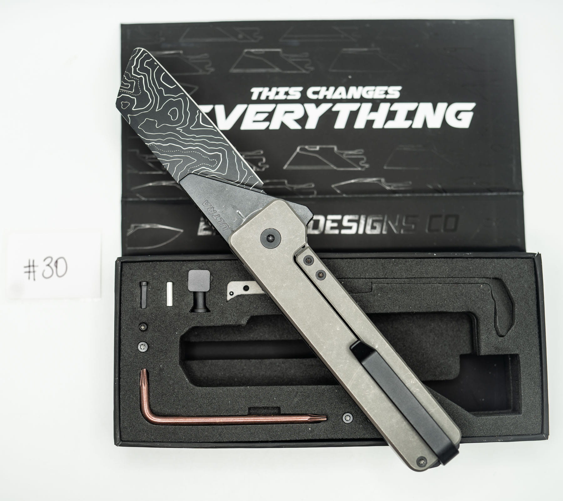 ITEM #30 — TiRant ULTRA Custom CARBON FIBER RH Scale + Dark-Wash Ti LH Scale Jet-Black Hardware Kit Installed + W/Full Jet-Black Clip + Custom Rounded Butter-Tip Butter Sheepsfoot TOPO Blade (6AL-4V Ti + Box Kit) 10/10 NEW / RARE CONTRAST — Only One Available