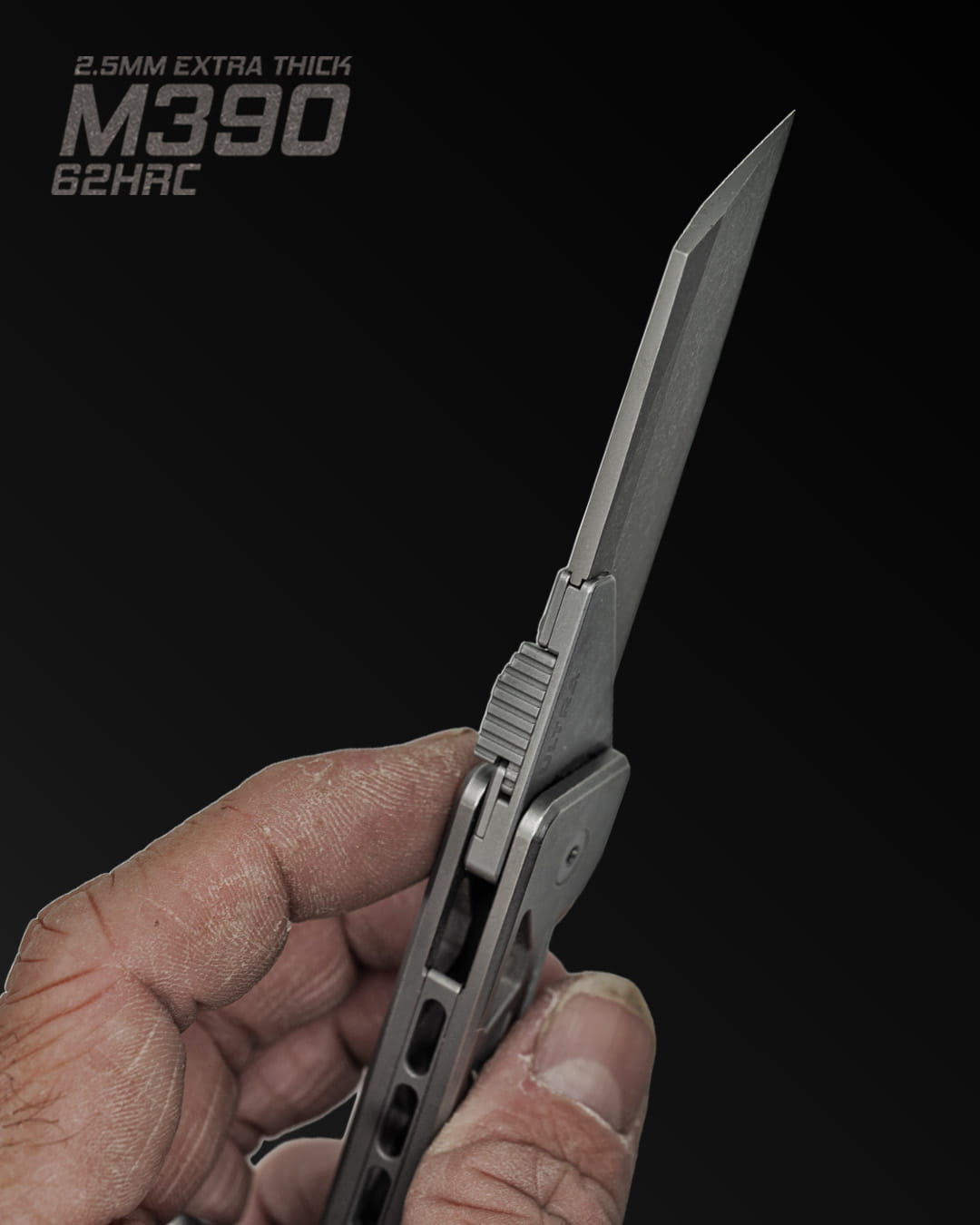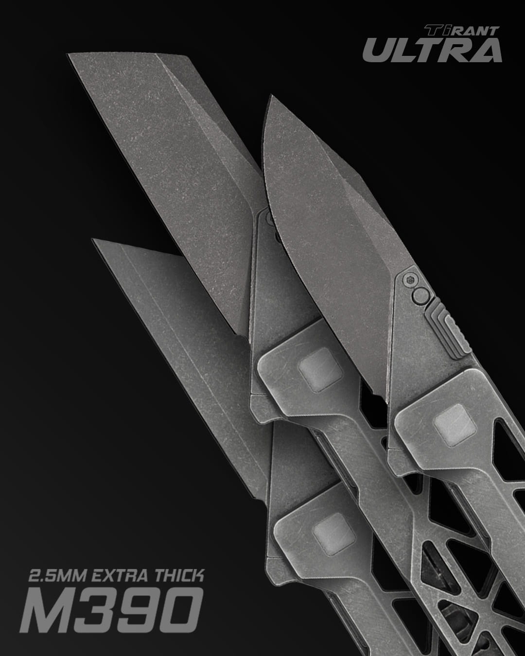 We finally have PREMIUM M390 Steel blades — Compatible with all tiRant ULTRA models These are fully ground like a real blade and are robust coming in at 2.5mm thickness for our extra-thick labeled blades and 1.5mm for all others. Our tempered M390 is sitting some solid HRC numbers with testing coming in around 61.8-62.8 averaging 62 HRC. Each M390 blade allows for resharpening multiple times and excellent wear resistance, edge retention and durability!