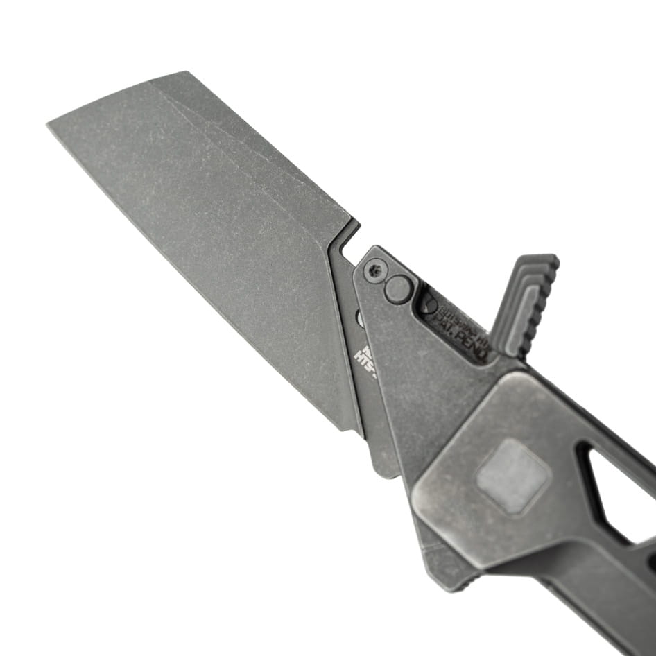 • Custom geometric thumb stud — doubles as the triple-locking cam for the patent-pending HotSwap blade holder design.