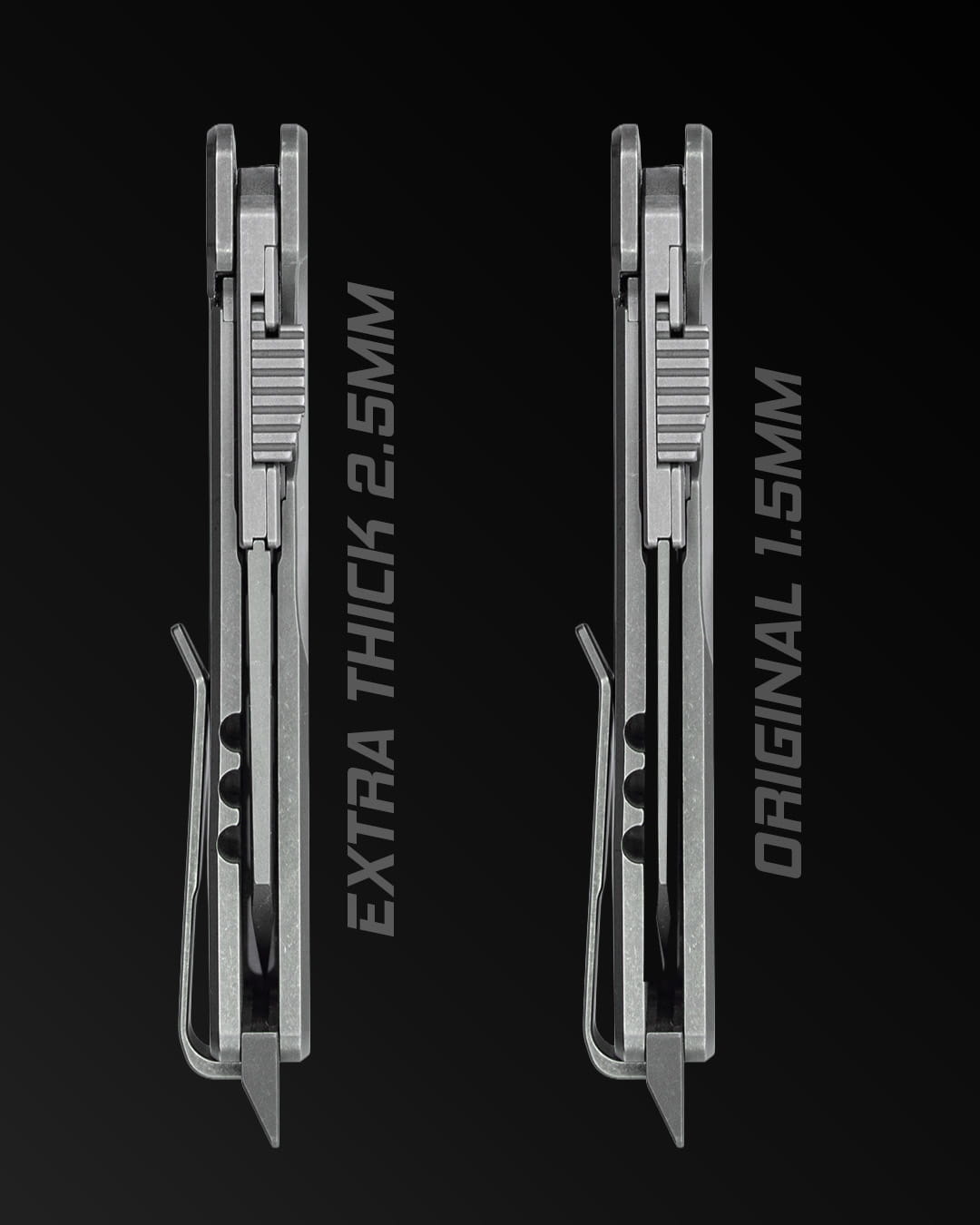 • CNC’D 6AL-4V Titanium Deep-Carry Clip — reversible for LH or RH carry attached to a custom rear spacer that meets perfectly with the blade when closed.